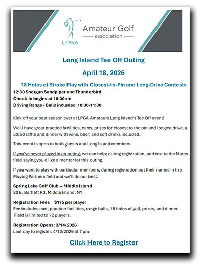 | End of Season Awards Dinner Celebration The End of Season Awards Dinner Celebration brings together our LPGA Amateurs Long Island Chapter for a fun evening of dinner, drinks, congratulations and thanks, shared with each other, for all the achievements, volunteer efforts, and golf highlights throughout another wonderful 2025 season! |